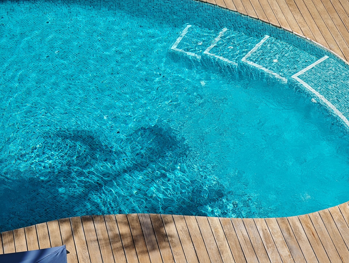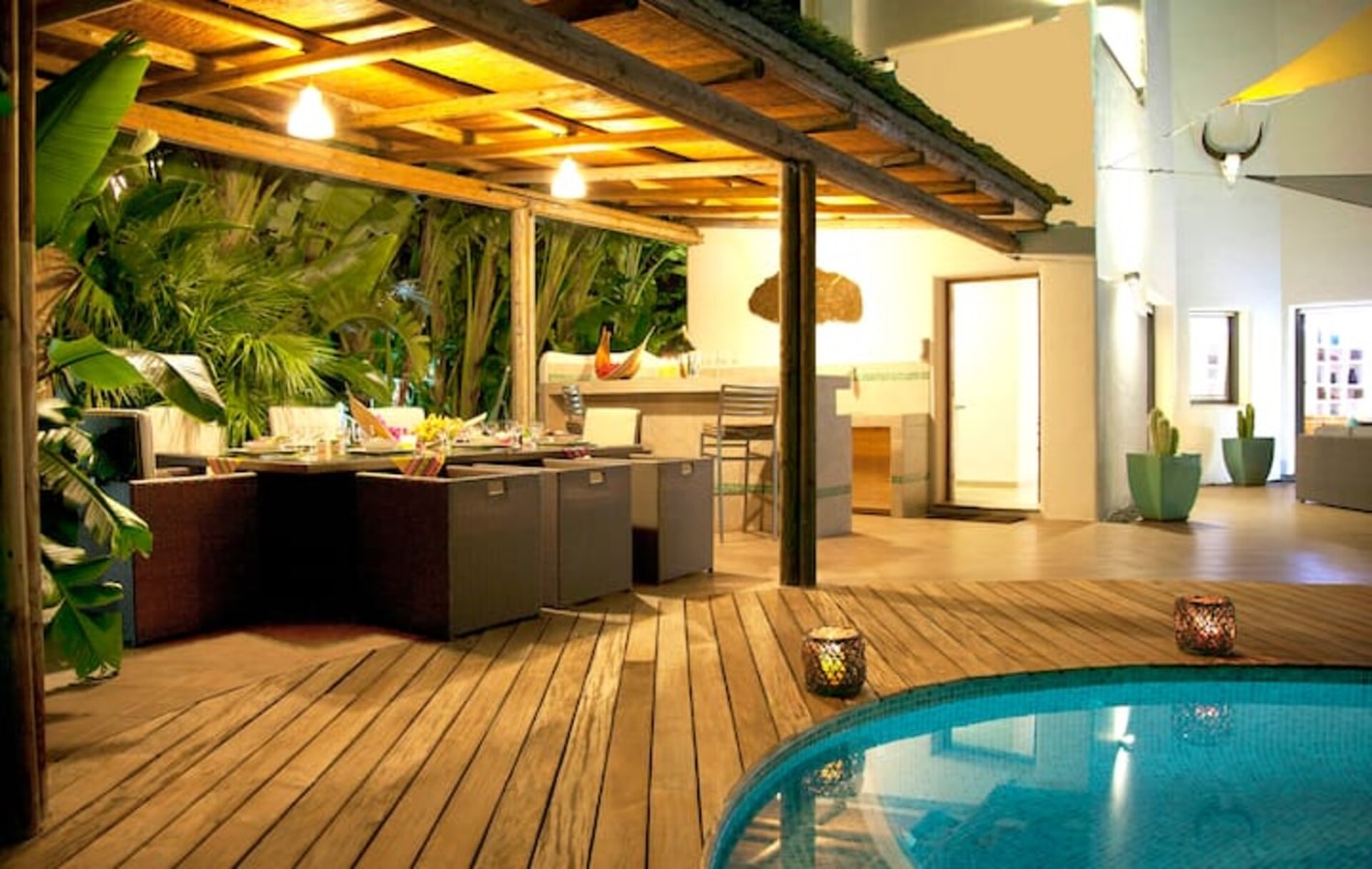 Large private pool, with wooden deck and privacy provided by exotic plants.